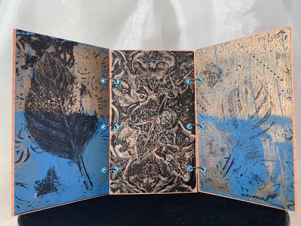 I’m “behind” already, but participants have lifetime access to the courses, which is great. Here’s my latest adventure. I strayed far off course from the project in Tania Ahmed‘s wonderful session but ended up making a little triptych on vintage library cards with leaf prints and bits of stencils.